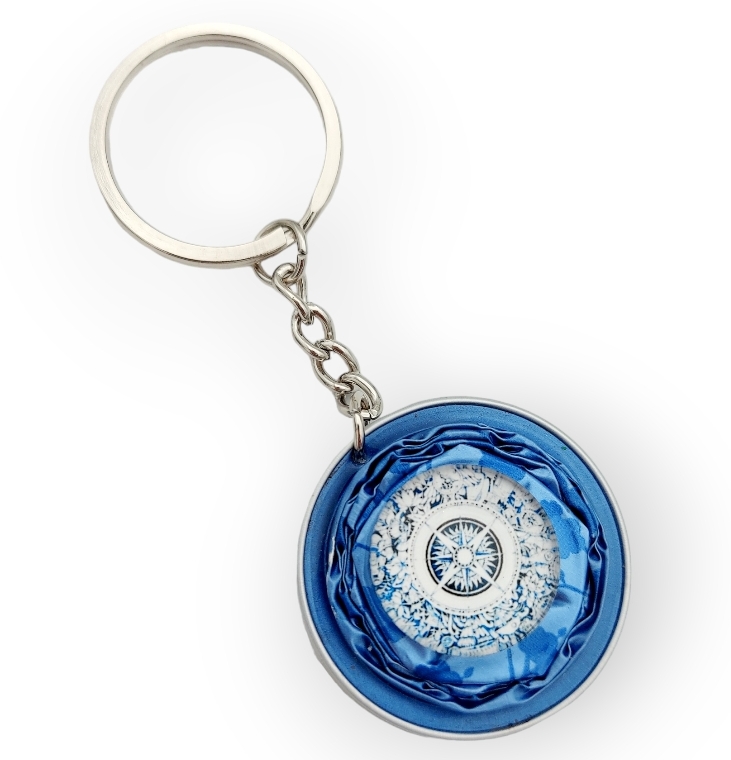 Obesek za ključe iz kavnih kapsul v modri barvi z dodanim stekelcem z motivom kompasa. Je izredno lahek in primeren za oba spola. Obesek je enak na obeh straneh in meri v dolžino 9,5 cm.