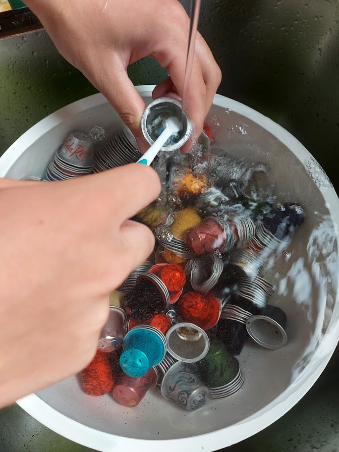 Za začetek sem pričela ločevati kavo od kapsule. Kavo sem uporabila kot naravno gnojilo za vrt, v kombinaciji z oljčnim oljem ali medom pa tudi za piling telesa. Z barvnimi kapsulami sem nato eksperimentirala, se zabavala in opazovala kaj nastaja.